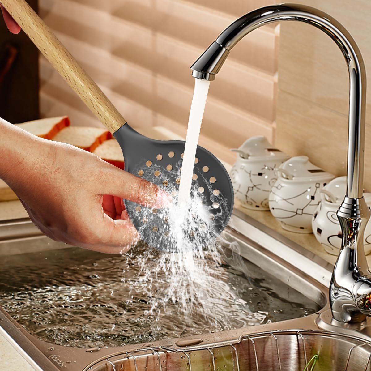 - HEAT RESISTANT & DURABLE: Our silicone kitchen utensils set features upgraded thickened silicone, enhancing durability and elasticity for a smoother cooking experience. Withstands up to 446°F (230°C) without melting or warping, retaining shape even after frequent use. Soft, thick heads protect cookware from scratches, suitable for nonstick pans and daily high-heat cooking